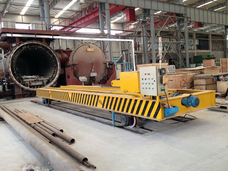 河南百分百公司定制型真空爐擺渡軌道地平車主要由上、中、下三層車身組成。下層地平車為長距離地軌運行,中層小車利用滾輪或者絲杠傳動與真空爐內軌道連接。上層停車位齒輪齒條傳動可與真空爐內的料車自動連接,將料車推入或者拉出真空爐。變頻裝置應用于第二層軌道與真空爐內軌道連接時平穩(wěn)無沖擊力,運行安全可靠。