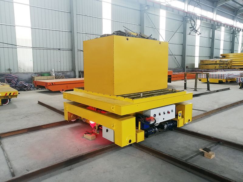 在現(xiàn)在的自動(dòng)化生產(chǎn)車間,常常會(huì)見到很多的交叉軌道,這樣的交叉軌道不只是讓不同軌道上的車輛各自行走,還要求不用的軌道之間互相交換,來實(shí)現(xiàn)不同軌道上的車輛將物件運(yùn)輸?shù)浇徊孳壍赖墓ぷ魑恢蒙?,針?duì)這種工況,百分百公司設(shè)計(jì)了十字交叉平移換軌地平車。