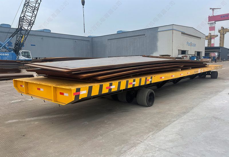 該案例中的平板車是舟山的一個(gè)項(xiàng)目,主要被用來在廠區(qū)和碼頭之間轉(zhuǎn)運(yùn)煤渣和鋼板。轉(zhuǎn)運(yùn)煤渣的時(shí)候配套有可拆卸的料斗裝置。轉(zhuǎn)運(yùn)鋼板的時(shí)候吧料斗拆除掉,平板車可以裝在50噸的鋼板。